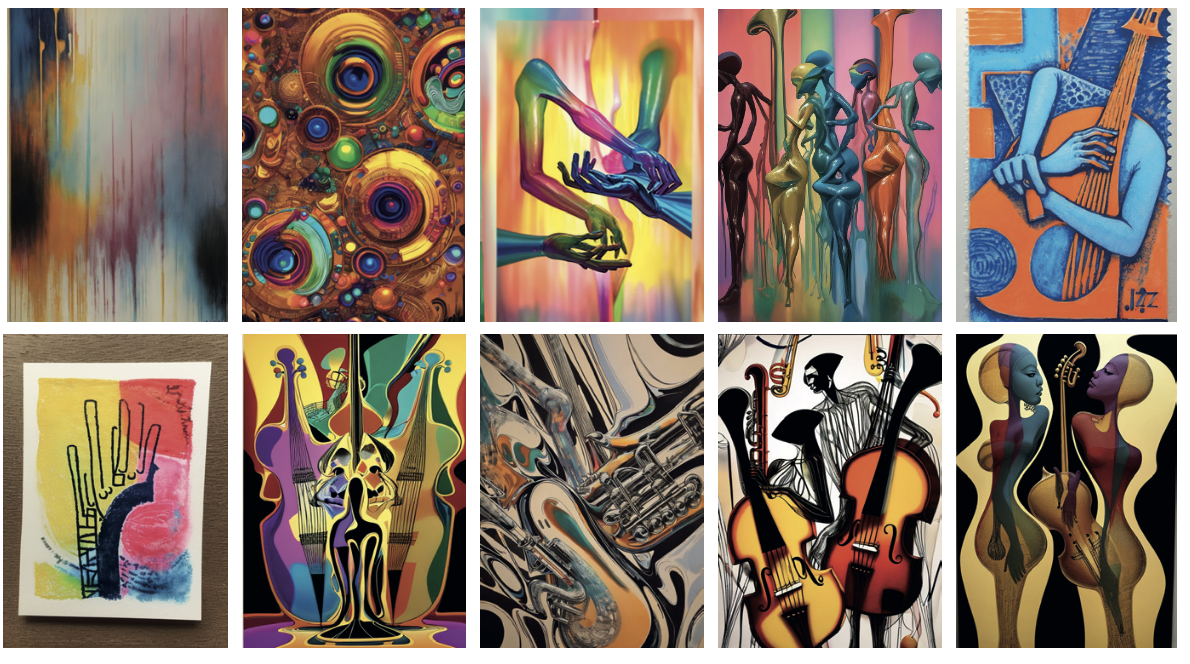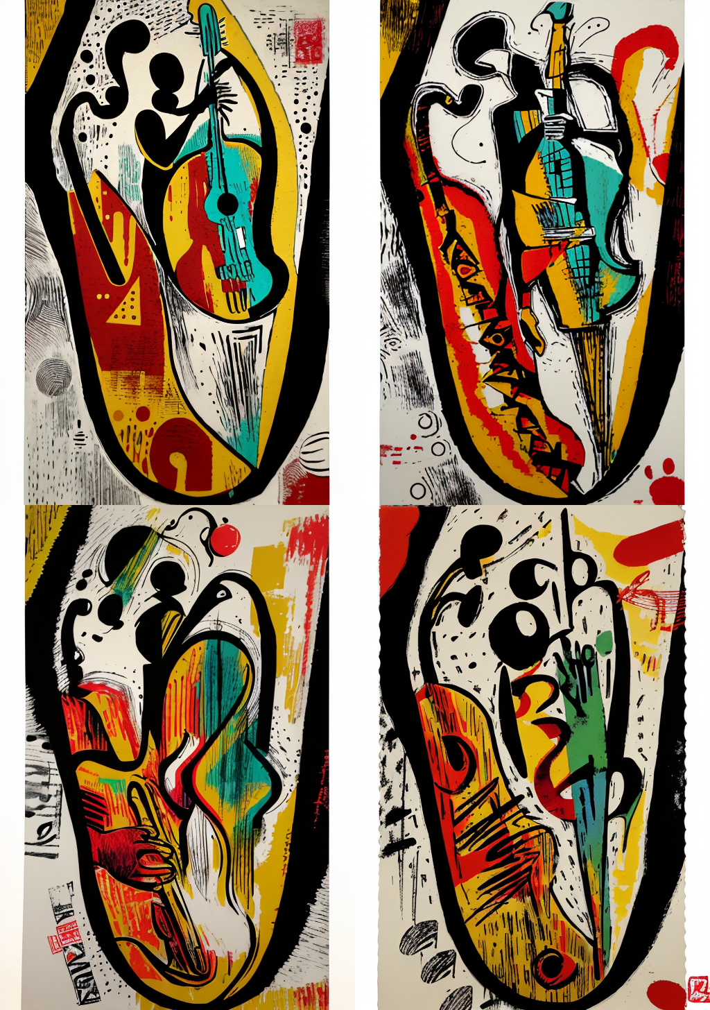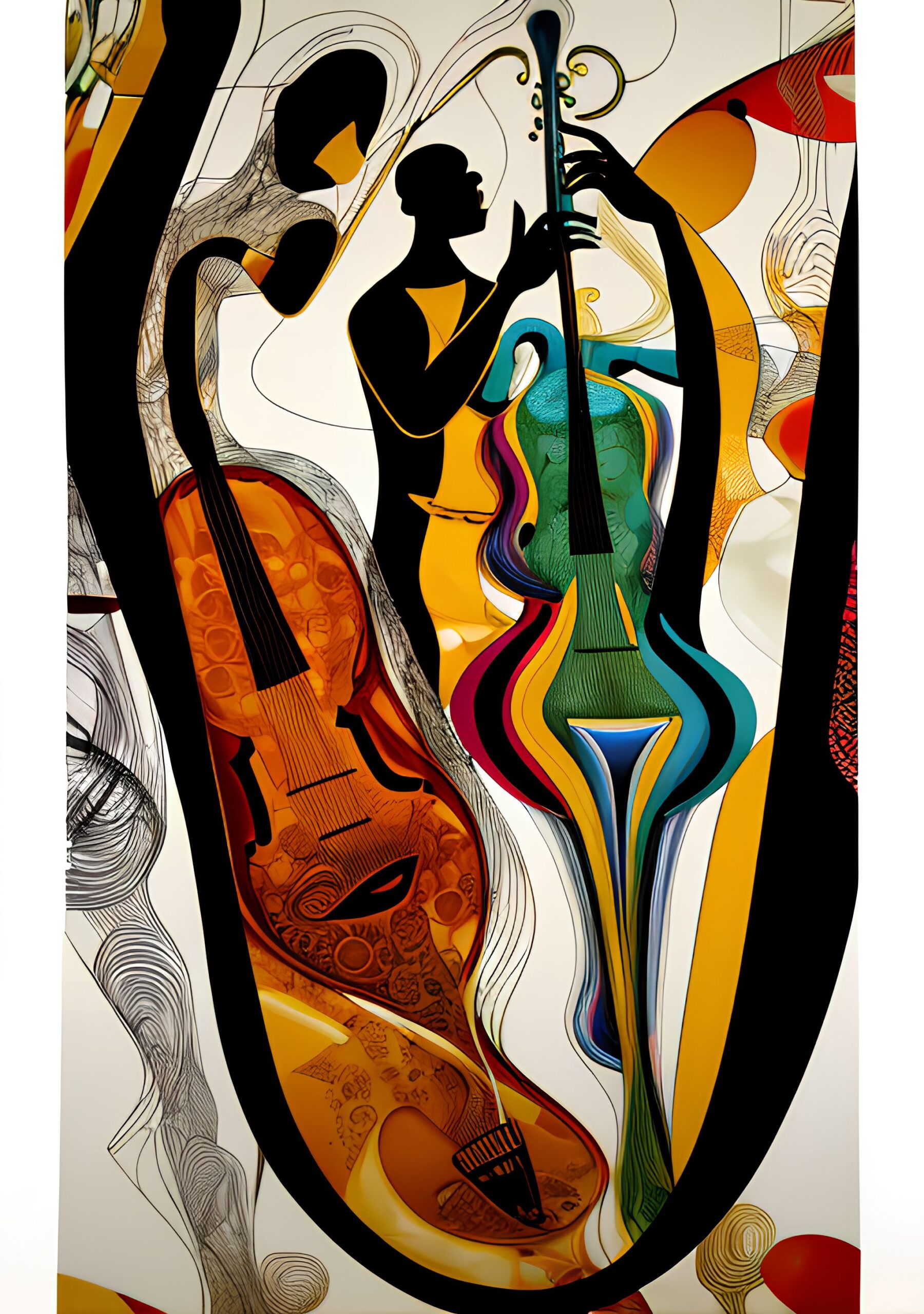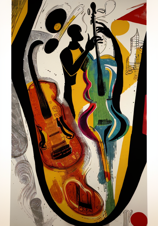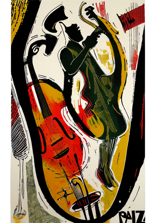Dernæst brugte jeg Stable Diffusion til at give mig en fortolkning af jazz musik. Den endelige illustrationer er derfor også udviklet via kunstig intelligens.